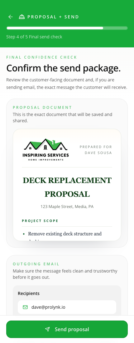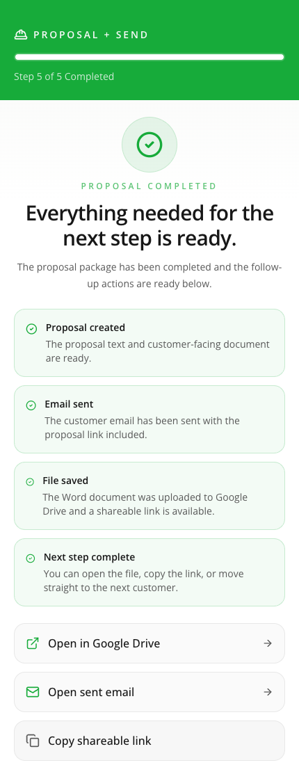 Completed send state showing proposal created, file saved, email sent, and next step complete